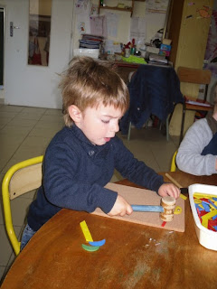 Nous travaillons continuons a travailler le schéma corporel en faisant des bonhommes au marteau.
