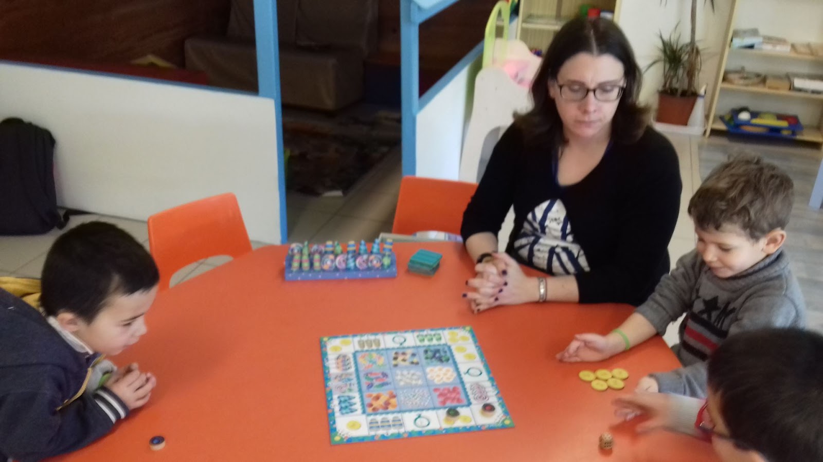 Mercredi matinée jeux de sociétés : le magasin de bonbons, les petits chevaux, equilibry (faire tenir sur une demi-sphère des solides).